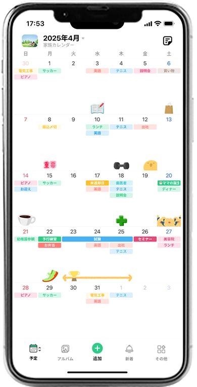 - 保育園の行事や通院、買い物予定など家族の予定を1つのカレンダーにまとめることでスムーズな家事育児の連携が可能です。