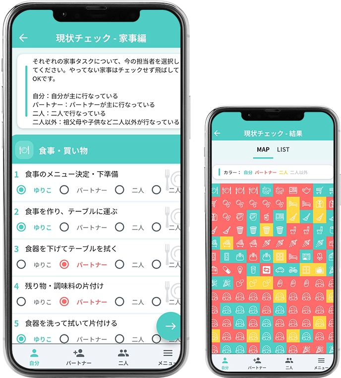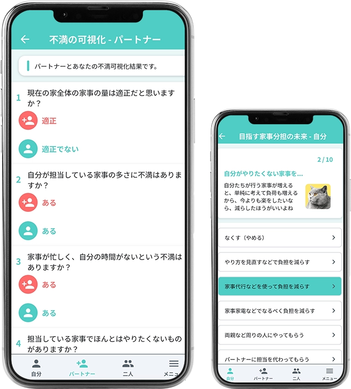 夫婦の家事育児分担を見える化し、対話を促すアプリ。理想の分担を一緒に考え、納得感のある家事育児スタイルを築きます。